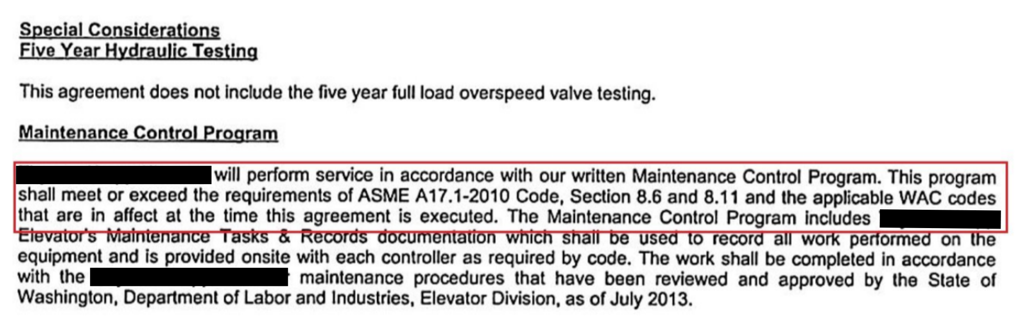 Some elevator maintenance companies by adding 8.11 Inspections to a new maintenance contract used "Special Considerations” or “Exclusions” - these contracts were likely increased and extended for five-years.