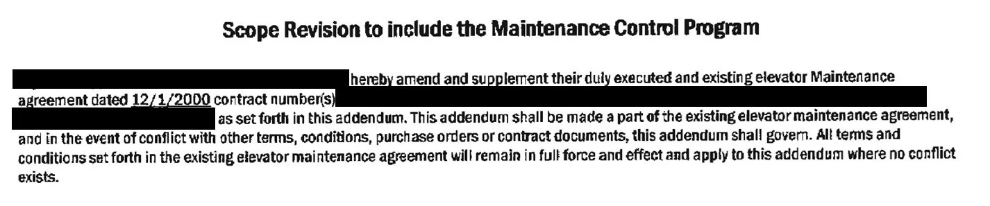 This is the big category. Most maintenance customers received an Addendum to have their maintenance company add 8.11 to their contract coverage. In exchange, their maintenance cost was increased by $50, $75, $150, some were over $300 per elevator per month! In addition to this potential increase in customer costs, some contract or agreement addendums had a section buried in the fine print that automatically extended the existing term for an automatic roll-over long term. Again, typically it was another five-years and may not have been clear through discussions but only through careful contract review. Some elevator companies sold thousands of these addendums to their maintenance customers, adding potentially hundreds of thousands of dollars to their monthly maintenance revenue.