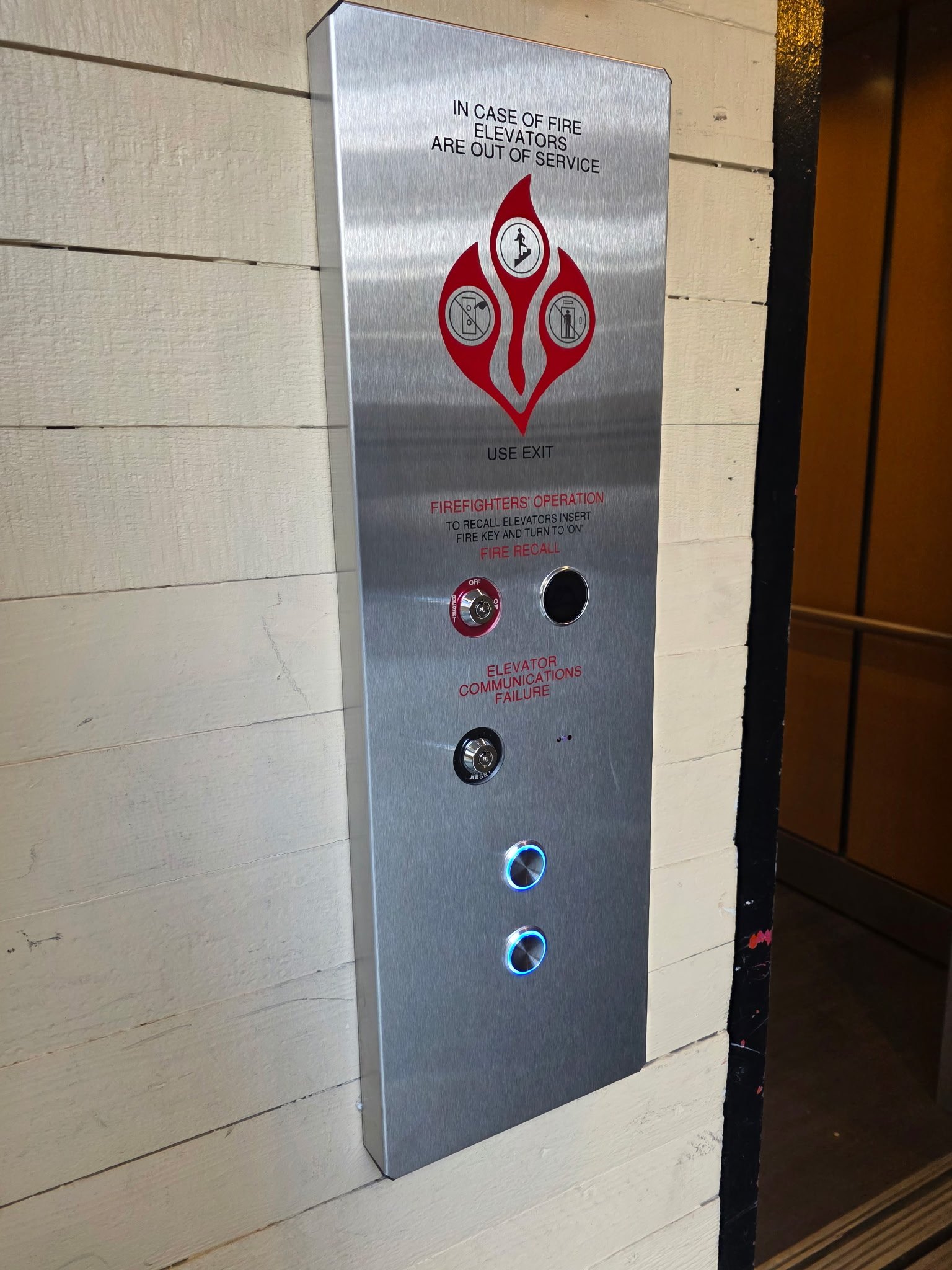 New hall fixtures. This main hall station includes Phase I Fire Service key switch and indicator and an Elevator Communications Failure indicator and key switch. These are required by ASME A17.1-2019 (Current code in Seattle).